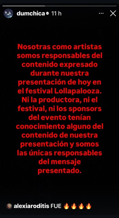Dum Chica debió salir a aclarar que «ni la productora, ni el festival, ni los sponsors del evento tenían conocimiento alguno del contenido» y que ellas son «las únicas responsables del mensaje presentado».